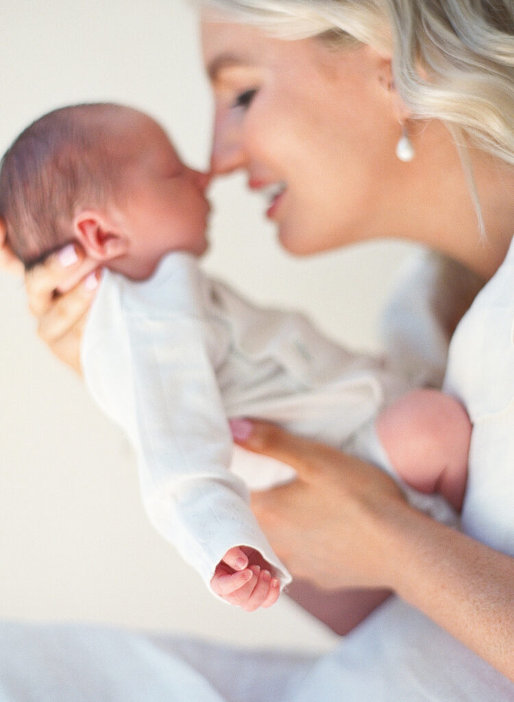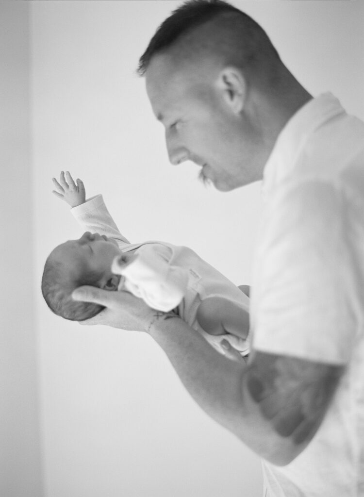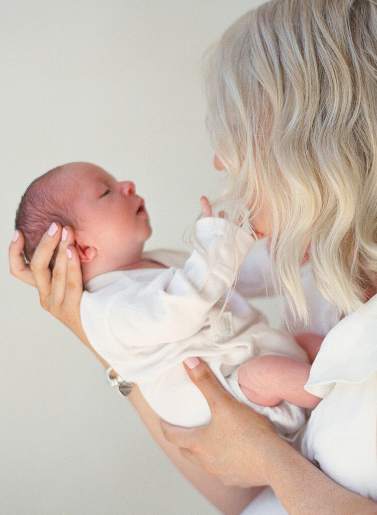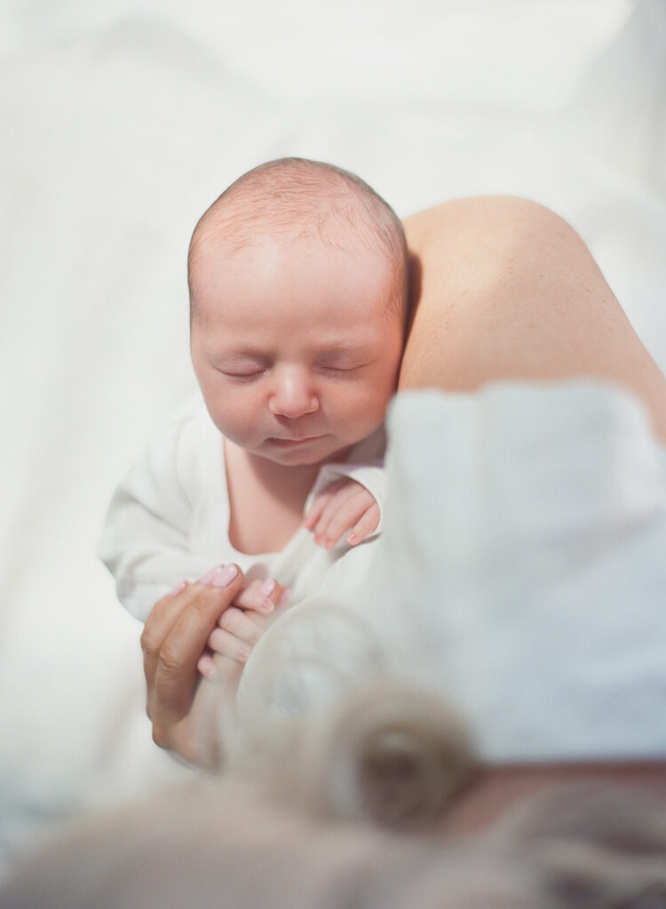 This sweet family chose to document their newborn chapter exactly where it’s unfolding – in the space that already holds their memories. No packing bags. No rushing out the door. Just slow moments, warm blankets, and the gentle cadence of life settling into a new shape.
